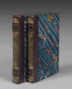 RELIURE DE L'ÉPOQUE. Dos ornés en veau glacé aubergine, plats de papier marbré bleu. Le relieur a par mégarde relié dans le t. I le cahier 28 du t. II (pp. 433 à 449)