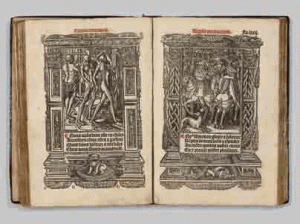 ILLUSTRATION : 12 gravures sur bois imprimées avec le calendrier, 46 grandes gravures imprimées dans des encadrements architecturaux, 30 gravures plus petites représentant des saints