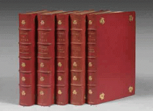 RELIURES DE L'ÉPOQUE SIGNÉES DE CHAMBOLLE-DURU. Maroquin rouge, trois croissants dorés dans les angles, dos à nerfs ornés, tranches dorées sur marbrure, gardes de papier peigne, couverture et dos conservés seulement pour le tome 5