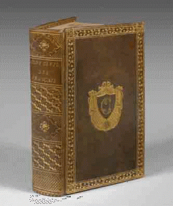 RELIURE DE L'ÉPOQUE. Maroquin olive, décor doré, armes au centre des plats, encadrement d'une roulette, dos long orné, tranches dorées