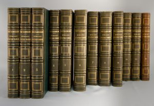 papier gaufré vert avec un filet doré de séparation entre le cuir et le papier. Collationné et complet, conforme à la collation de Carteret tome 1 page 163/164. La liste des souscripteurs est bien présente. Les couvertures n'ont pas été reliées dans ces volumes. Une mouillure sur l'ensemble du tome 2, petite jusqu'au feuillet 200 et s'élargissant jusqu'au dernier feuillet. Ce dernier feuillet est d'ailleurs chiffré 164 au lieu de 364 comme l'indique Carteret. Manque de papier au feuillet 319 du tome 8. Le dos du 12ème et dernier volume est insolé et à viré au marron clair. Belle série, toujours recherchée