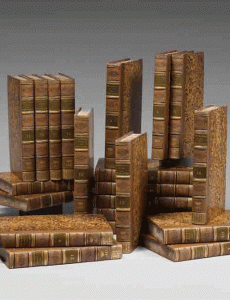 RELIURES UNIFORMES DE L'ÉPOQUE. Dos et coins de veau havane, nerfs ornés, chiffre couronné doré en queue des dos, tranches marbrées