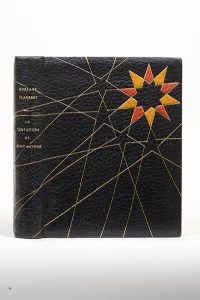FLAUBERT (Gustave). La Tentation de Saint Antoine. Grenoble, Roissard, 1956. In-8, maroquin noir, étoile aux branches mosaïquées de maroquin citron et corail à un coin du premier plat, filets dorés formant 4 étoiles et se prolongeant sur le dos...