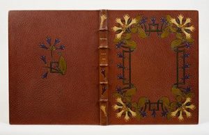 large encadrement d'entrelacs orné de corolles d'iris violets et jaunes sur le premier plat, et une gerbe d'iris violets au centre du second plat, dos orné de même, bordure intérieure encadrée d'un listel mosaïqué et de filets à froid, doublure et gardes de soie multicolore, doubles gardes, couverture, tranches dorées sur témoins (S. David).