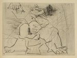 Édition originale de ce superbe ouvrage d'Iliazd publié, à la demande de la Bibliothèque nationale, en hommage au célèbre graveur parisien Rogelio Lacourière, qui travailla pour les plus grands peintres illustrateurs de livres. # L'hommage d'Iliazd est précédé d'un texte de Pablo Picasso, également en édition originale, commençant par les mots Aux quatre coins de la pièce... Ce poème est brillamment mis en valeur par un subtil jeu typographique conçu par Iliazd. Il répond à l'effet esthétique qu'avait initialement voulu Picasso pour son texte lorsqu'il l'avait gravé sur cuivre. # L'édition est ornée de 13 gravures originales à l'eau-forte ou à la pointe-sèche à pleine page, dont trois en couleurs d'André Beaudin, Max Ernst et Joan Miró et dix en noir de Camille Bryen, André Derain, André Dunoyer de Segonzac, Alberto Giacometti, Alberto Magnelli, Louis Marcoussis, André Masson, Jules Pascin, Pablo Picasso et Léopold Survage. # Tirage à 75 exemplaires numérotés, celui-ci un des 50 sur vieux japon, signé par Iliazd à la justification, mais aussi par tous les artistes – hormis Derain, Giacometti, Pascin et Marcoussis, décédés avant la parution du livre – au crayon noir ou de couleur sur une double page de l'ouvrage. # Très belle reliure d'Alix renformant le dernier album collectif publié par Iliazd, l'une des ses plus belles réalisations. # Galerie Flak, Paris, 1991, p. 26 – Chapon, Le Peintre et le Livre, p. 296 – Bloch, 1243 – Cramer : Picasso, 141 – Cramer : Masson, 77 – Cramer : Miró, 120.