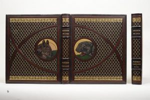 Édition illustrée de 31 compositions en couleurs de Paul Jouve, gravées sur bois par Perrichon. # Tirage à 119 exemplaires sur papier vélin d'Arches, celui-ci le n°18, un des 15 comportant 6 suites : une suite en noir sur japon ancien, une suite en noir sur japon impérial, une suite en couleurs sur japon impérial, une suite des hors-texte avec fond d'or, une suite de quelques états non terminés et une suite des essais à l'eau-forte. Les suites sont numérotées et signées par l'éditeur. # Exemplaire enrichi d'épreuves supplémentaires reliées dans le premier volume : Le Sommeil du condor sur japon portant un envoi autographe de Paul Jouve à Georges Guillaumin ; le justificatif des essais d'eaux-fortes sur vélin d'Arches et une suite en couleurs sur japon ancien. # Remarquable ensemble dans une superbe reliure mosaïquée et doublée, exécutée par Yseux.