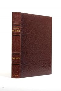 MÉRIMÉE (Prosper). Carmen. Paris, Éditions de la Roseraie, 1926. In-4 couronne, maroquin lie-de-vin, doublure de maroquin bleu canard serti d'un filet doré, gardes de moire lie-de-vin, doubles gardes de papier, tête dorée, double filet doré...