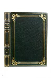doublure et gardes de moire rose, doubles gardes de papier, tranches dorées sur témoins, couverture et dos, étui (Noulhac).