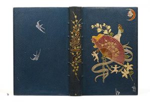 frappé de deux hirondelles au palladium, dos lisse portant le titre dans un décor mosaïqué et doré, doublure de maroquin bleu nuit, roulette intérieure dorée, gardes de soie brochée, doubles gardes, tranches dorées, couverture et dos, étui (Ch. Meunier).