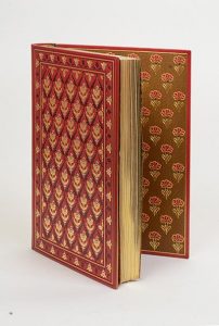 VOLTAIRE. Zadig ou la Destinée. Paris, Amis des Livres, 1893. In-8, maroquin rouge avec décor en treillis poussé à froid orné d'un semé de grandes fleurs à collerettes dorées et au palladium sur les plats, se poursuivant sur le dos lisse...