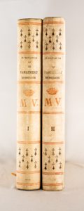 volumes in-folio reliés en plein vélin à la Bradel, avec dos lisse orné d'hermine, titre et auteur en noir. Initiales M.V. surmontées d'une couronne rouge. Couvertures conservées. Tome 1 et 2 : ff. 890 pp. (pagination continue) et 2 if. de table. Beaux exemplaires.