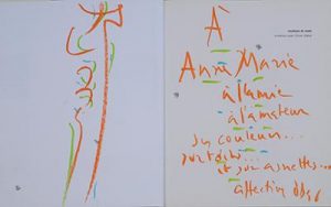 Monographie de l'artiste illustrée de reproductions photographiques de ses œuvres. # Superbe envoi autographe signé de l'artiste sur le faux-titre, accompagné d'un dessin original en regard, le tout au pastel orange, vert et bleu.