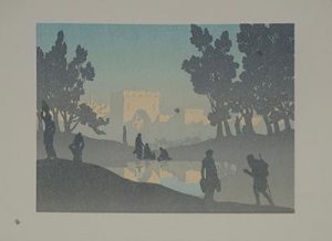 Édition illustrée de 11 compositions en couleurs par Henri Rivière, dont 2 en couverture, une à double page, 7 à pleine page et une vignette de titre. Légende en huit tableaux représentée pour la première fois au Théâtre Antoine le 7 avril 1898. La lettre du titre, le décor de la garde intérieure, les cachets et fleurons ont été dessinés par George Auriol. # Un des très rares exemplaires de tête sur papier aigle vélin à la cuve d'Arches, celui-ci le n°12, sur un tirage total de 20, signé au crayon bleu par Henri Rivière à la justification. # Couverture et marges des feuillets salis, liens de la couverture manquants.