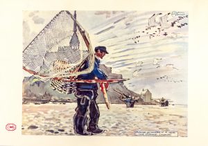 4 menus de la Maison Prunier illustrés par Mathurin Méheut. Format 37 x 25 cm, 3 menus de 1963/1964/1965 intitulés H pécheurs de crevettes et de coques. Mont Saint-Michel (manche) ". 1 menu de 1963 intitulé, Mar- seille, au vieux port,...