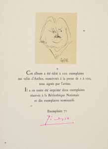 Édition illustrée de 9 lithographies en noir par Pablo Picasso. # Cet ensemble, réalisé par l'artiste à la demande de Fernand Mourlot, est composé de 7 portraits d'une même série, datés 25 novembre 1952 et numérotés de I à VIII sur le papier report (le n°II figure en réduction sur la page de justification) et du dessin du 7 décembre 1952. L'album fut publié à l'initiative de Michel Leiris qui accompagna les planches de l'artiste d'un essai. # Tirage limité à 112 exemplaires sur vélin d'Arches, tous signés à la justification par Pablo Picasso. # Superbe exemplaire tel que paru. # Jean Hugues, 50 ans d'édition de D.-H. Kahnweiler, n°35 – Cramer, n°86 – François Chapon, Le Peintre et le livre, pp. 122, 286.