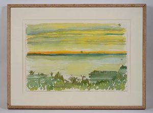 JACQUEMIN (André). Coucher de soleil. Aquarelle originale signée. Golfe Juan, 1985. 37,5 x 55 cm. Sous cadre.