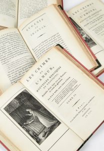 Bibliothèque de l’Arsenal, Les Choix de Pierre Leroy, 2016, nº 40 : l’exemplaire exposé comprend des notes de Sade quant à l’illustration et le dessin original du frontispice du tome IV.- Bibliothèque Bodmer, Sade, 2014, nº 84 : pour l’exemplaire de la collection de Jean Bonna. Notice de Vérène de Soultrait.- Cohen, 922 : l’exemplaire A. Bégis est le seul cité.- Monglond, V, 343-344.- Martin-Mylne, Bibliographie du genre romanesque français, 1751-1800, 1977, p. 456 : les exemplaires de la British Library et de la Bibliothèque nationale de France sont portés manquants.