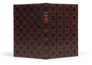 In-8 (243 x 155 mm) de (2) ff., XXII pp., (1) f. blanc, 322 pp. mal chiffrées 324 : maroquin aubergine orné d’un décor à répétition de compartiments quadrilobés, chacun serti de deux filets dorés et d’un listel à froid, dos à nerfs, coupes filetées or, bordures intérieures décorées, doublures et gardes de soie violette, couvertures imprimées conservées, tranches dorées sur témoins (Huser).