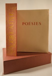 VERLAINE Paul - Poésies choisies et préfacées par Pierre Mac Orlan Éditions Arc-en-ciel, Paris, 1953. 1 volume in-folio en feuilles avec couverture rempliée légèrement déchirée sur le mors. Chemise ornée du nom de l'auteur et étui de...
