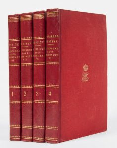 4 volumes in-8 (219 x 135 mm) de (2) ff., 381 pp., (1) f., 1 tableau dépliant; (2) ff., 382 pp., (1) f.; (2) ff., 396 pp., (1) f.; (2) ff., 374 pp., (1) f., 1 tableau dépliant: demi-chevrette rouge, dos lisses ornés, chiffre couronné doré au centre des plats, non rognés (reliure de l'époque).