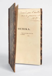 Rahir, Bibliothèque de l'amateur, p. 411.- Carteret, I, 250: un seul exemplaire cité.- Escoffier, Le Mouvement romantique 1788-1850, n° 496: collation erronée.- Scheler, Un best-seller sous Louis XVIII, in: Bulletin du Bibliophile, 1988, pp. 11-28: “Au cours d'une période trop souvent marquée par un obscurantisme militant, Ourika se révélait porteur d'une clarté qui n'était rien de moins qu'un précieux reflet du Siècle des lumières.”
