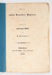 KIERKEGAARD, Søren Aabye. Af en endnu Levendes Papirer, udgivet mod hans Villie [Extrait des papiers d’une personne encore vivante, publié contre sa volonté].Copenhague, C.A. Reitzel, 1838.