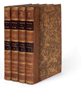 Les quatre volumes portent, au dos, le chiffre couronné du monarque, ainsi que la mention de la Bibliothèque de l’Intendance Générale de la Liste Civile. Cachet rouge de la bibliothèque sur les titres et cote manuscrite sur les doublures.