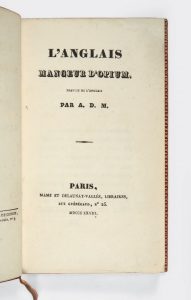 [MUSSET, Alfred de.] Thomas DE QUINCEY. L’Anglais mangeur d’opium. Traduit de l’anglais par A.D.M. Paris, Mame et Delaunay-Vallée, 1828.