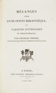 NODIER, Charles. Mélanges tirés d’une petite bibliothèque, ou Variétés littéraires et philosophiques. Paris, Crapelet, 1829.