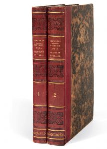 2 volumes in-8 (204 x 124 mm) de (1) f., LXXXVI pp., (1) f., 298 pp., (1) f. [pour les pages 212 bis et ter], (2) ff. d’errata ; (2) ff., 450 pp. chiffrées 452 [les pages 21 à 24 étant imprimées sur un seul feuillet], (1) f. d’errata : demi-veau cerise, dos lisses ornés or et à froid (Lestringant).