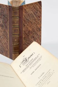 Comme très souvent, l’exemplaire ne comprend pas le feuillet final du tome II signalé par Carteret sur lequel “on trouve la reproduction de deux étiquettes de 1822 qui sont la copie de celles qui ont servi à la brochure du livre à cette époque”, étiquettes rendues inutiles par la reliure.