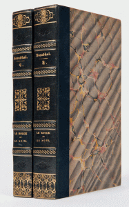 Guère apprécié à sa parution, Le Rouge et le Noir ne se rencontre que fort simplement relié à l’époque. Ici, la reliure en demi-maroquin décoré, d’un type inhabituel, est d’une grande séduction et parfaitement conservée : sans doute un des plus beaux exemplaires connus.