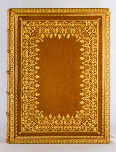 Missale Romanum Fricferici Pustet. Rome. 1909, 1 volume. fort et grand in-4'. relié en plein maroquin Havane clair. Plats ornés de multiples roulettes dorées encadrant un décor à la plaque très travaillé, dos à nerfs ornés avec fleur de lys...