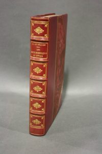 Dos à 5 nerfs cloisonné et fleuronné portant le titre doré, filets dorés sur les plats, tête dorée, couverture et dos conservés.