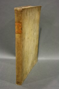 Un volume, in-4, de XVI pp., 218 pp., pleine reliure de l'époque en vélin rigide ivoire. Dos lisse portant une pièce de titre en maroquin vieux rouge, tranches mouchetées de brun et de rouge.