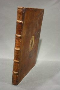 Dos à 5 nerfs orné de filets dorés et portant le titre manuscrit, filet doré autour des plats ornés, en leur centre d'un large fer floral doré, tranches jaspées.