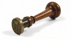[Toulouse] Cachet ovale en bronze des entrepôts de sel de Toulouse, monté sur bois tourné. Cachet fleurdelysé, donc antérieur à 1830.