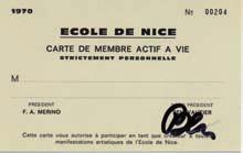 école de Nice. Carte de membre actif à vie, n° 204 signé de Ben.
