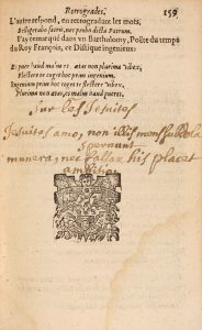 Annotations anciennes sur 2 pages (153 et 159), dont une faisant une allusion critique aux jésuites.