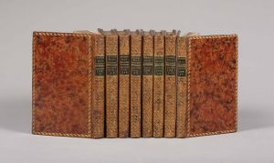 8 volumes petit in-8, reliure de l'époque veau écaille, dos lisse et orné, pièces de titre et de tomaison maroquin vert, roulette dorée bordant les plats et aux coupes, tranches dorées (accident sur un dos, deux autres frottés, trav., de vers sur un plat et un dos, des coins émoussés).