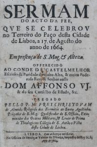 (Barbosa Machado 1, 570 ; Inocêncio 2, 67 ; BN Lisboa, Tip. port. séc. XVII 107 ; Arouca A 123 ; Cassuto, A. Bibliogr. sermões autos da fé 12 (Lisboa) ; Horch. Sermões autos da fé 62).