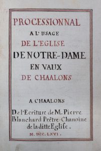 Au catalogue de la bibliothèque de Châlons-en-Champagne, on ne trouve que le processionnal du diocèse imprimé en 1745, un manuscrit du XVIIIe siècle d'une cinquantaine de feuillets, et un autre processionnal manuscrit de 1811.