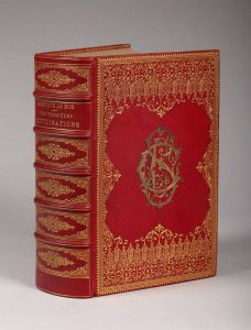 Fort in-4, 820 p., 443 illustrations dont 9 hors-texte reproduites en glyptographie, reliure plein maroquin rouge, dos à 5 nerfs, caissons et plats richement ornés aux petits fers, monogramme " SCG " en cuivre au centre du plat supérieur, double filet doré aux coupes, dentelle intérieure, contreplats et gardes doublés de satin moiré, tranches dorées [E. Rousselle].