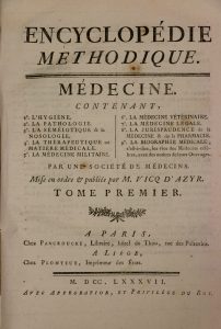 VICQ-D'AZYR (Félix) [Dir.]. Encyclopédie méthodique. Médecine. Tome I à VII (sur 13 : de A à Justus). P., Panckoucke, 1787 ; P., Agasse, 1798.