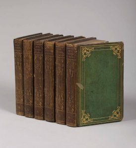 6 volumes in-18, reliure romantique basane verte, dos lisses et ornés, plats décorés d'un triple filet en bordure avec grands fleurons angulaires, coins guillochés, tranches marbrées (2 coiffes et les coins émoussés ; 2 gravures manquantes, brunissures marginales).