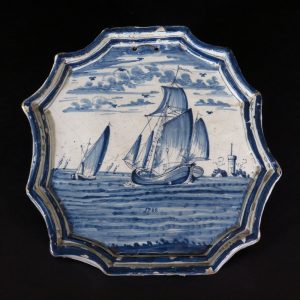DELFT, FRIESLAND. PLAQUE " VOILIERS ", XVIIIe siècle. Faïence décorée en camaïeu bleu de grand feu, scène de voiliers en bord de mer avec un phare, avec la date inscrite de 1788 dans le dessin et au verso.