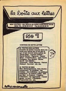 La boite aux lettres N° 1, 1998 au n° 11 juillet 2003. Illustrations en noir. Ses textes et ceux des autres. In-4ff. Manquent les numéros 2 et 5. Joint. • L'objet du délit. Revue in-4 ff. Illustrations en noir. N° 1, 2000. • Ethnisme. Revue