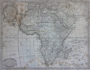 • DELISLE. Carte d'Afrique […], 1805, an XIV. Carte gravée en coloris d'époque. Mouillures, rousseurs, petit manque et déchirure. Non examinée hors de la marie-louise et du cadre. 51,4 × 64,3 cm.