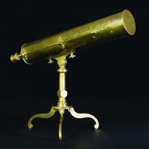 TÉLESCOPE À RÉFLEXION DE TYPE GRÉGORIEN, FRANCE, CIRCA 1770. Laiton, verre, miroir en acier poli. Non signé. Télescope monté sur un piétement tripode à pieds galbés pour les observations faites sur une table, avec réglage latéral à vis...