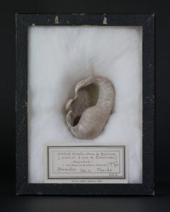 OSSELET D'OREILLE INTERNE DE BALEINE, FIN XIXe siècle. Avec inscription manuscrite sur étiquette : " Ouïe de baleineau, Miocène, Une dizaine de millions d'années, n° 162, Floride, Brewster Polk. Co. Floride. USA. "